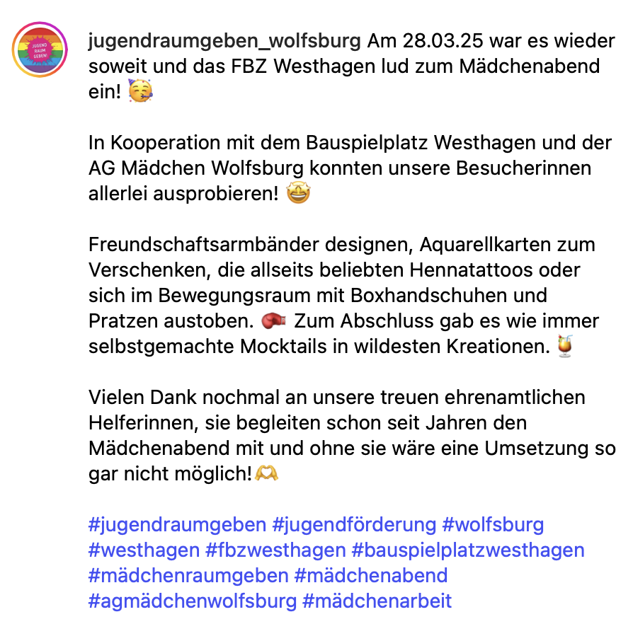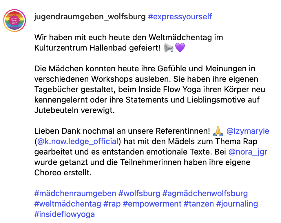 Die AG Mädchen ist auf Initiative der Jugendförderung der Stadt Wolfsburg entstanden und setzt sich aus Kolleg*innen der städtischen Jugendeinrichtungen und externen Kooperationspartner*innen zusammen.